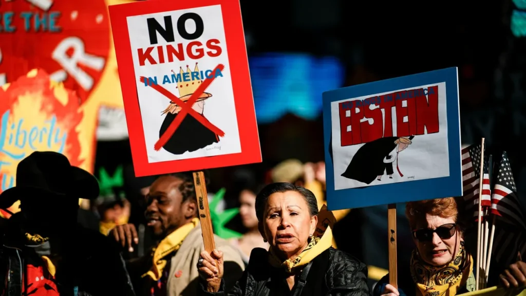 WASHINGTON (Realist English). Tens of thousands of Americans took to the streets across the United States on Saturday to protest what they called the authoritarian drift of President Donald Trump’s administration. The nationwide “No Kings” demonstrations filled public squares from Washington, D.C., to small towns in the Midwest, with participants carrying banners reading “Nothing is more patriotic than protesting” and “Resist Fascism.”